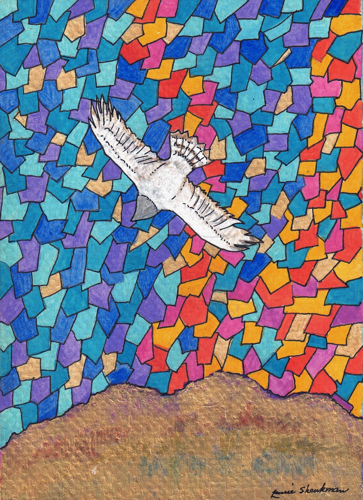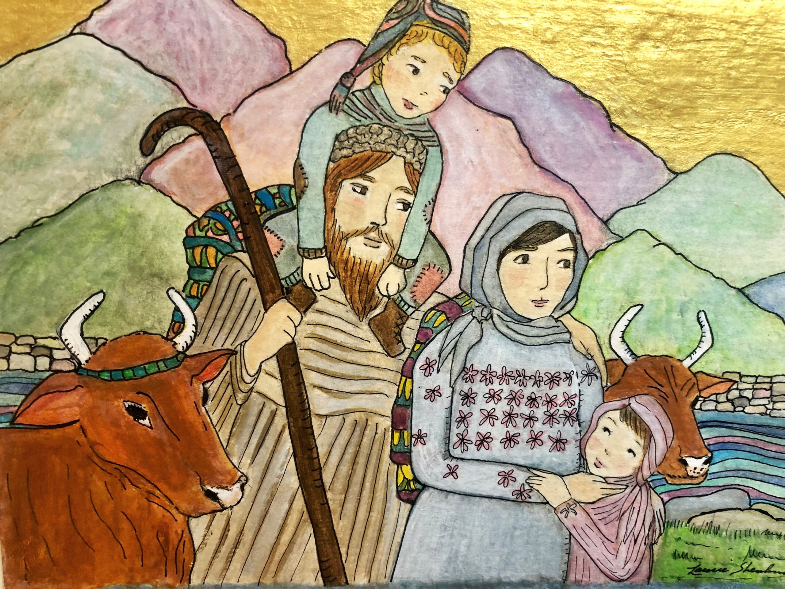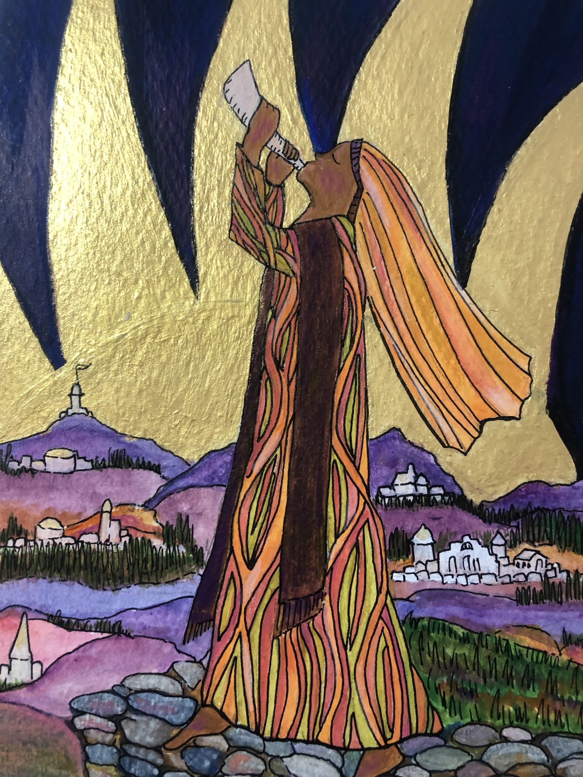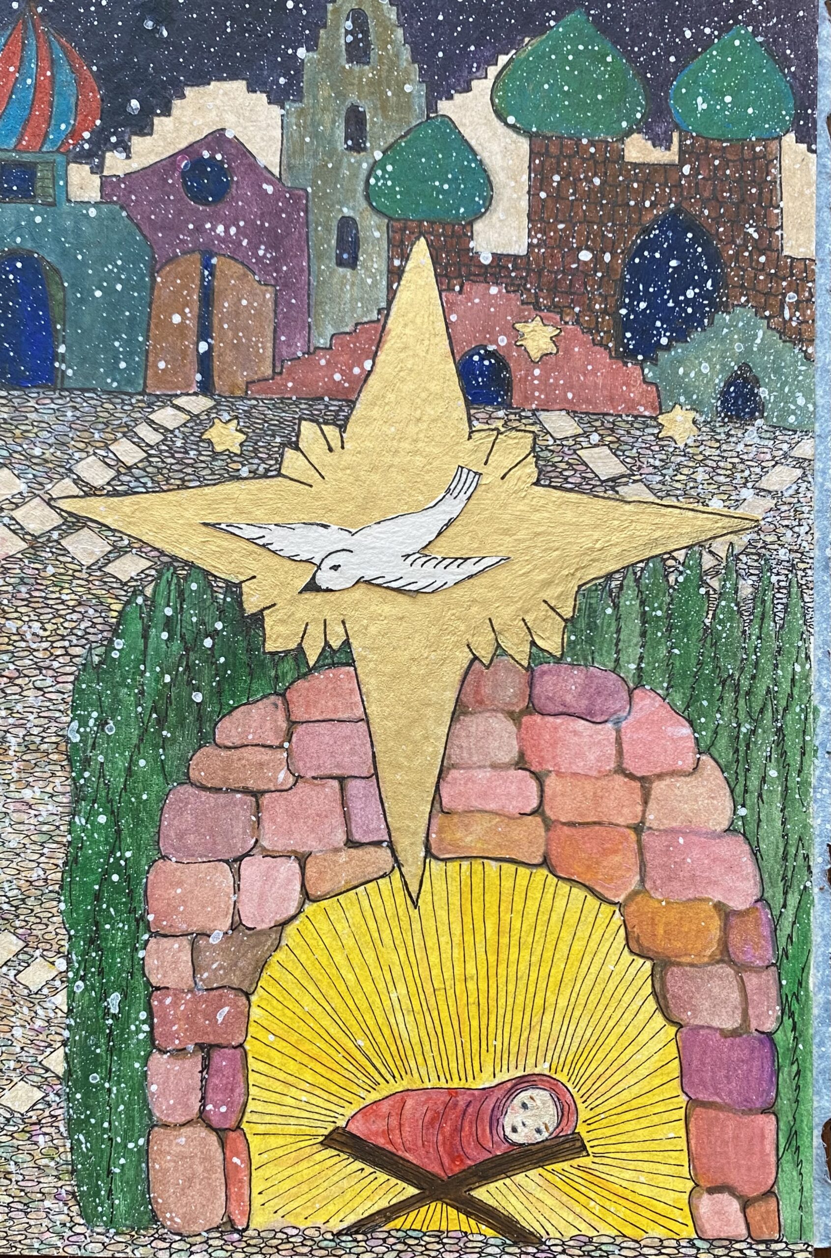 The Living Branch is a collection of scripturally inspired images that represent a contemporary expression of biblical verses and themes. Living Branch styles are distinctive, refreshing, and bold! Figures and details are crisp and precise! Designs seek to commune a reverential presence, like stained-glass windows of old, each with gilded treatments for a touch of splendor, reminiscent of medieval illuminated manuscripts. Currently, the Living Branch collection includes 36 styles, offered in 5” x 7” greeting card form with natural brown envelopes. Cards are available in packs of 6 or 12, either as an assortment or of one specific style. Packages are enclosed in clear plastic envelopes, secured with a golden tie, and tagged with a golden logo seal. The Living Branch also creates commissioned work for private individuals and non-profit organizations. Please request references or letters of recommendation. Suggested retail price on a 6-card pack ~ $25, 12-card pack ~ $50, or by donation.To facilitate order, shipping, payment or make a request for custom work please email: livingbranch3@rcn.com with a message of inquiry.
